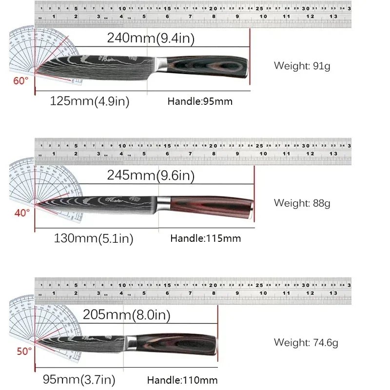This 3PCS kitchen knife set is designed for professional-level cooking at home. It includes a chef knife, santoku knife, and utility knife for versatile kitchen tasks. The laser Damascus-style blade design adds both beauty and performance. Sharp and durable blades ensure precise cutting, slicing, and chopping. Ideal for handling meat, vegetables, fruits, and herbs with ease. The balanced design provides excellent control and comfort during use. Built for long-lasting sharpness and daily kitchen demands. Perfect for home cooks and professional chefs alike. Easy to clean and maintain after each use. A stylish and powerful addition to any modern kitchen.