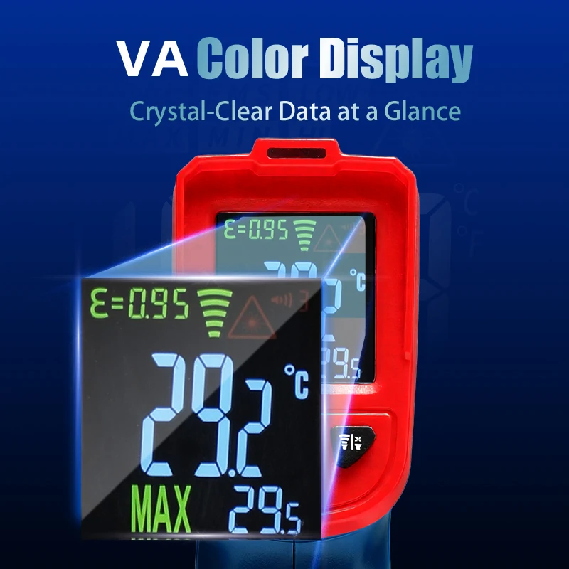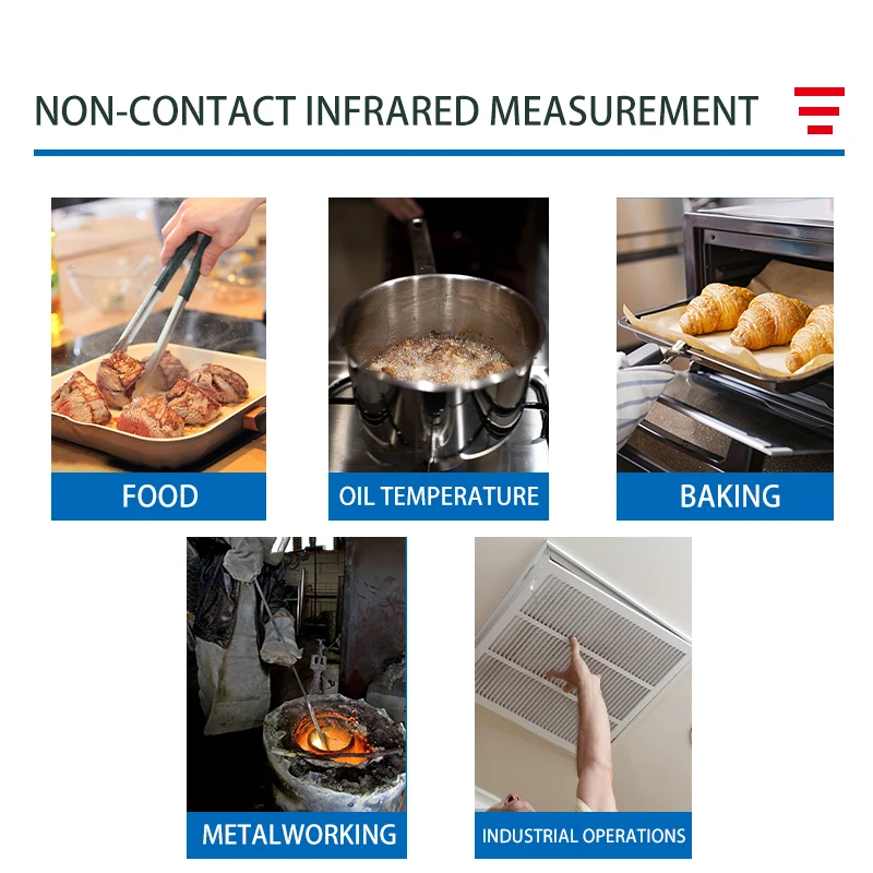 This infrared non-contact thermometer provides fast and accurate temperature readings without touching the surface. Equipped with a VA color screen for easy visibility and precise measurement. Handheld and lightweight design makes it convenient for industrial, kitchen, or laboratory use. High-precision electronic sensor ensures reliable and consistent results. Ideal for measuring food, machinery, liquids, or ambient temperatures. Non-contact design improves hygiene and safety during temperature checks. Easy-to-use interface allows quick operation and reading. Suitable for professional chefs, engineers, and home use. Durable and portable for versatile applications in cooking, labs, or industry. A practical and high-tech solution for accurate, safe, and efficient temperature measurement.