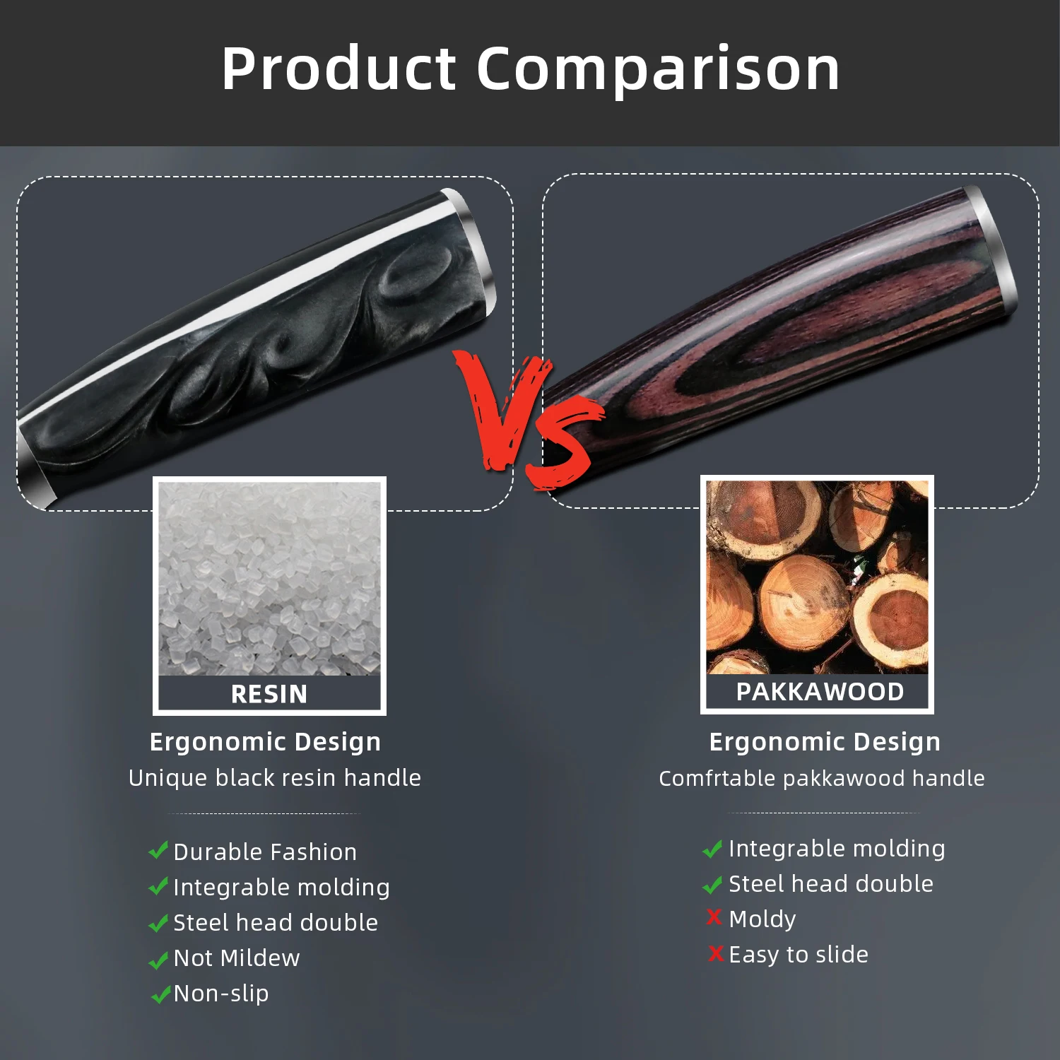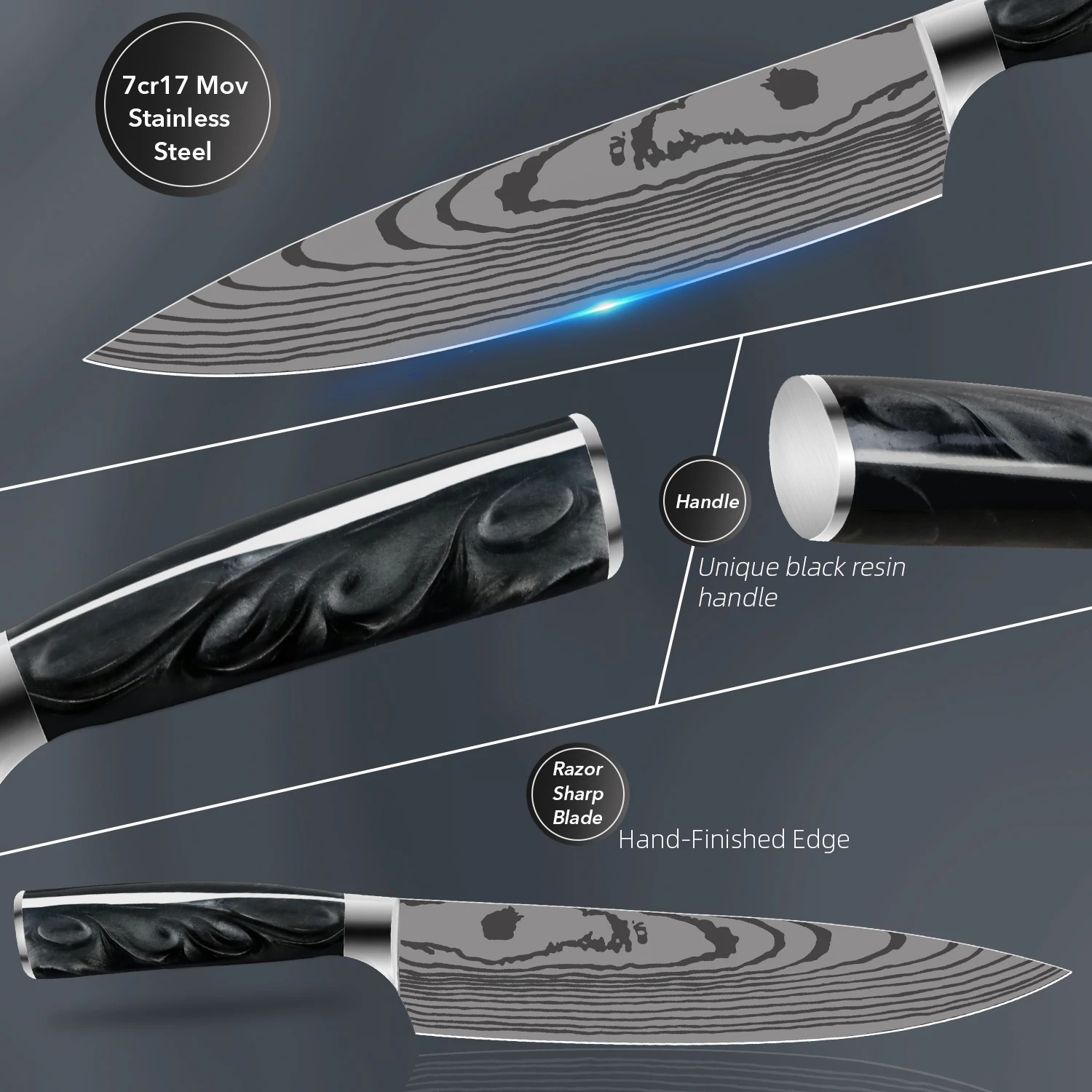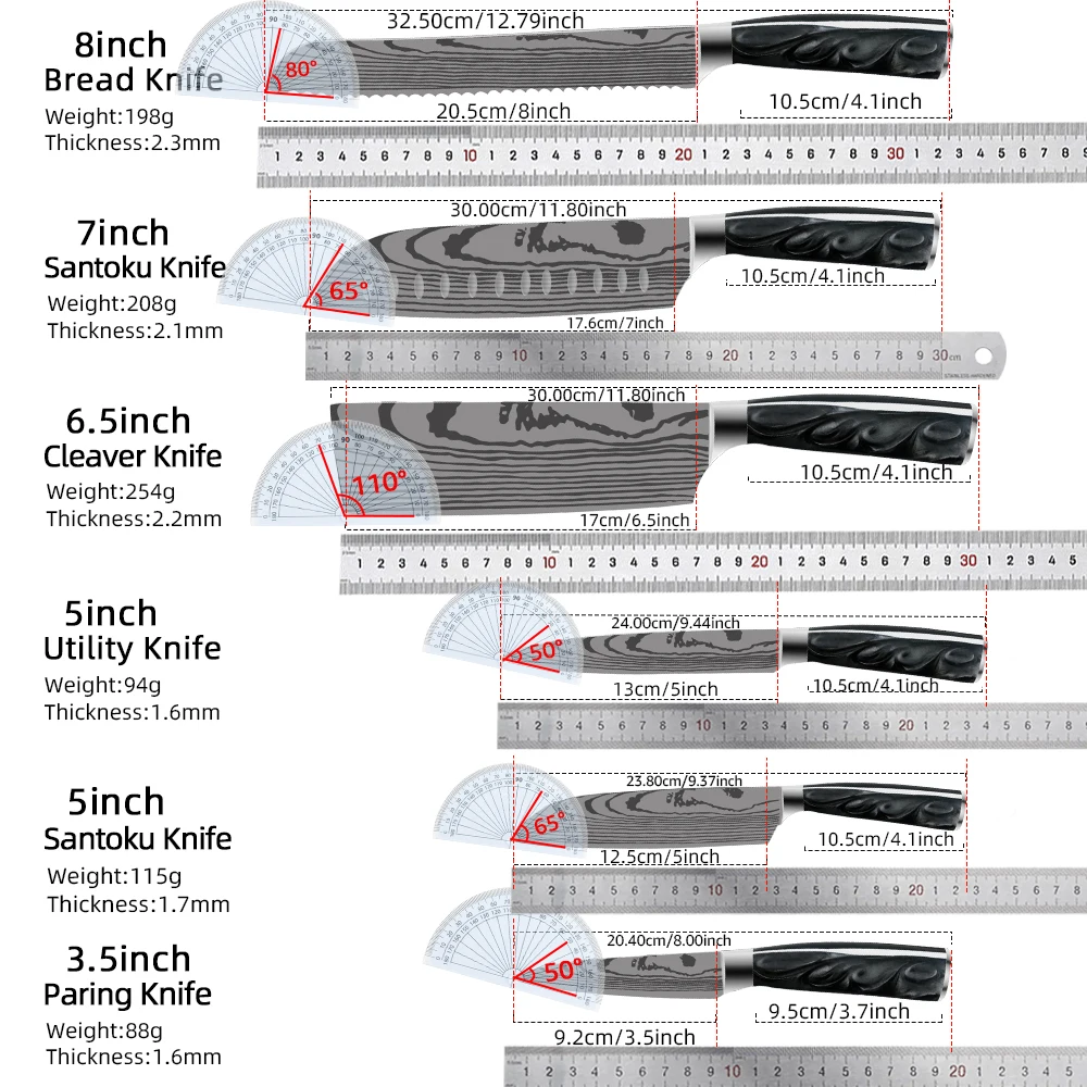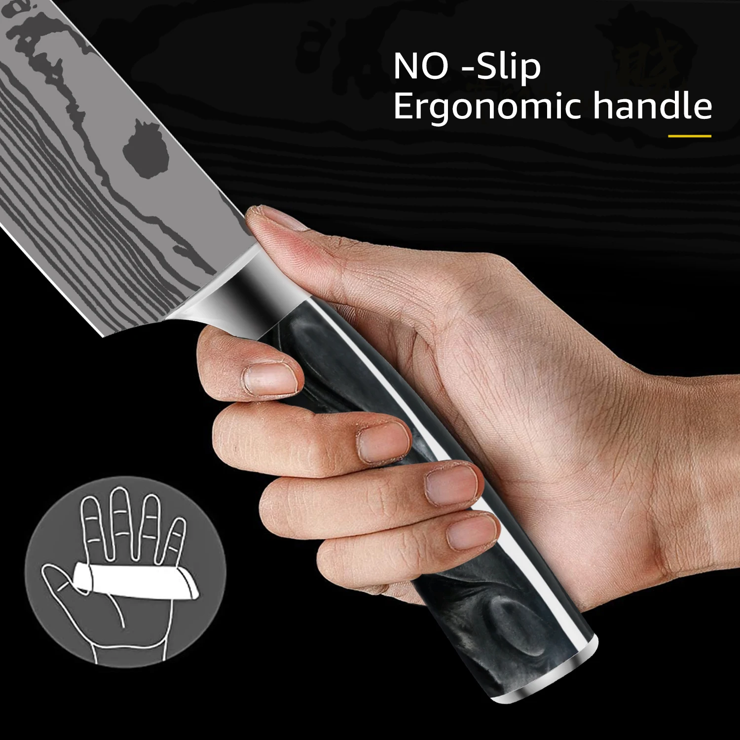 This Japanese kitchen knife set features precision-crafted blades with a stylish laser Damascus pattern. Made from high-quality 7CR17 stainless steel for durability and sharpness. Includes chef knife, Santoku knife, and cleaver for versatile kitchen tasks. The resin handles provide a comfortable and secure grip for safe cutting. Perfect for slicing, chopping, dicing, and mincing vegetables, meat, and fruits. Sharp edges allow effortless and precise food preparation. Ideal for home kitchens and professional chefs alike. Sleek and modern design adds elegance to your kitchen. Easy to clean and maintain for long-lasting performance. A complete, versatile knife set that combines style, function, and precision.